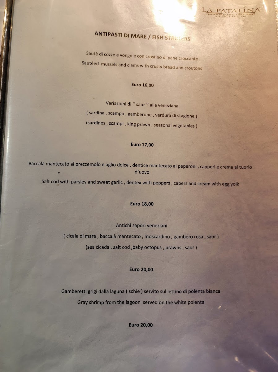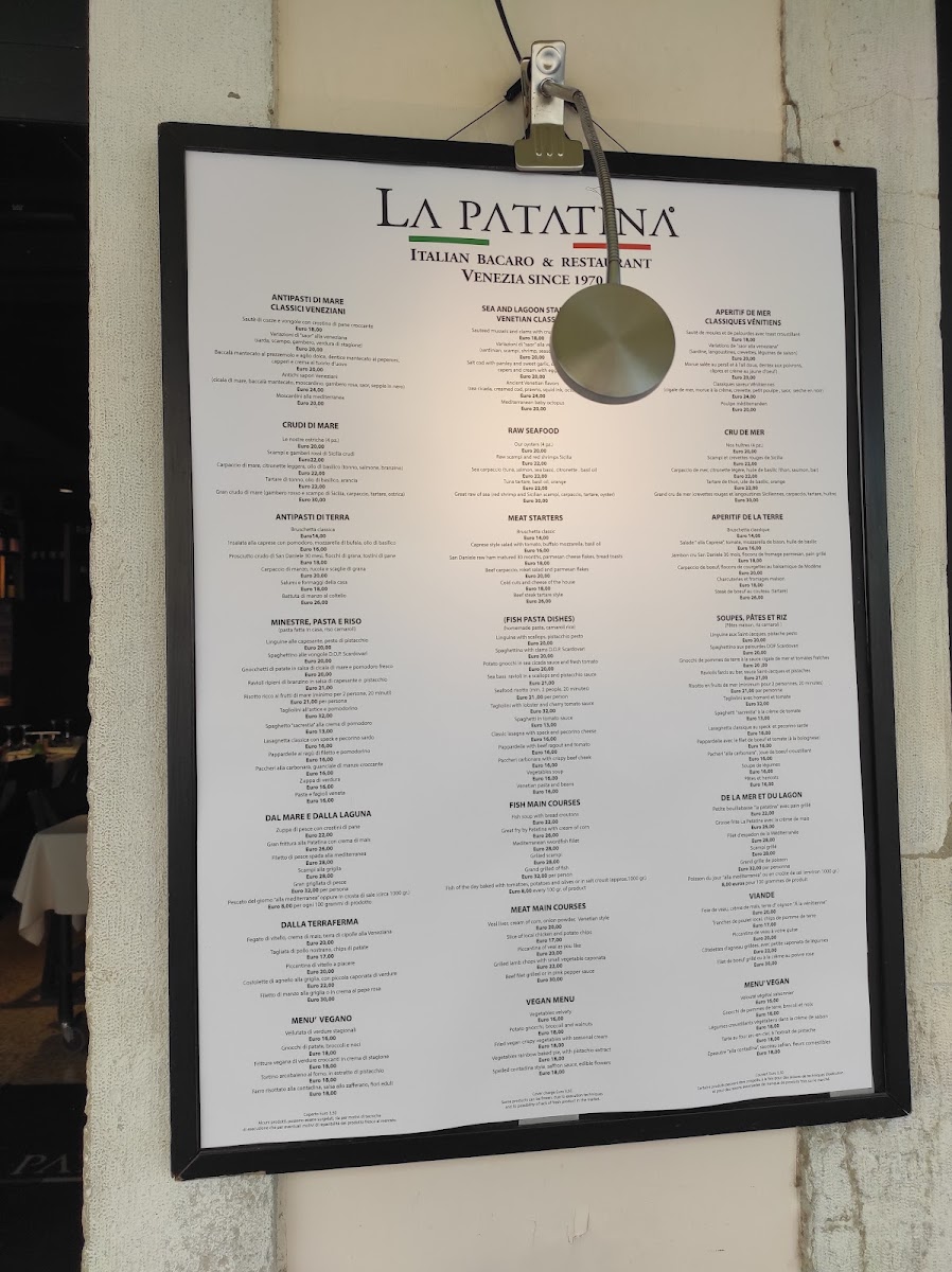 The menu at Patachic offers a thoughtful selection of Italian and Mediterranean dishes with a particular focus on fresh seafood and traditional flavors. It strikes a balance between casual and refined, perfect for enjoying a relaxed lunch or a leisurely dinner in the heart of Venice. The dishes are crafted to complement the warm, inviting atmosphere of the trattoria, whether you’re dining inside, in the charming garden, or at a table overlooking the lively Campo S. Giacomo da l'Orio.